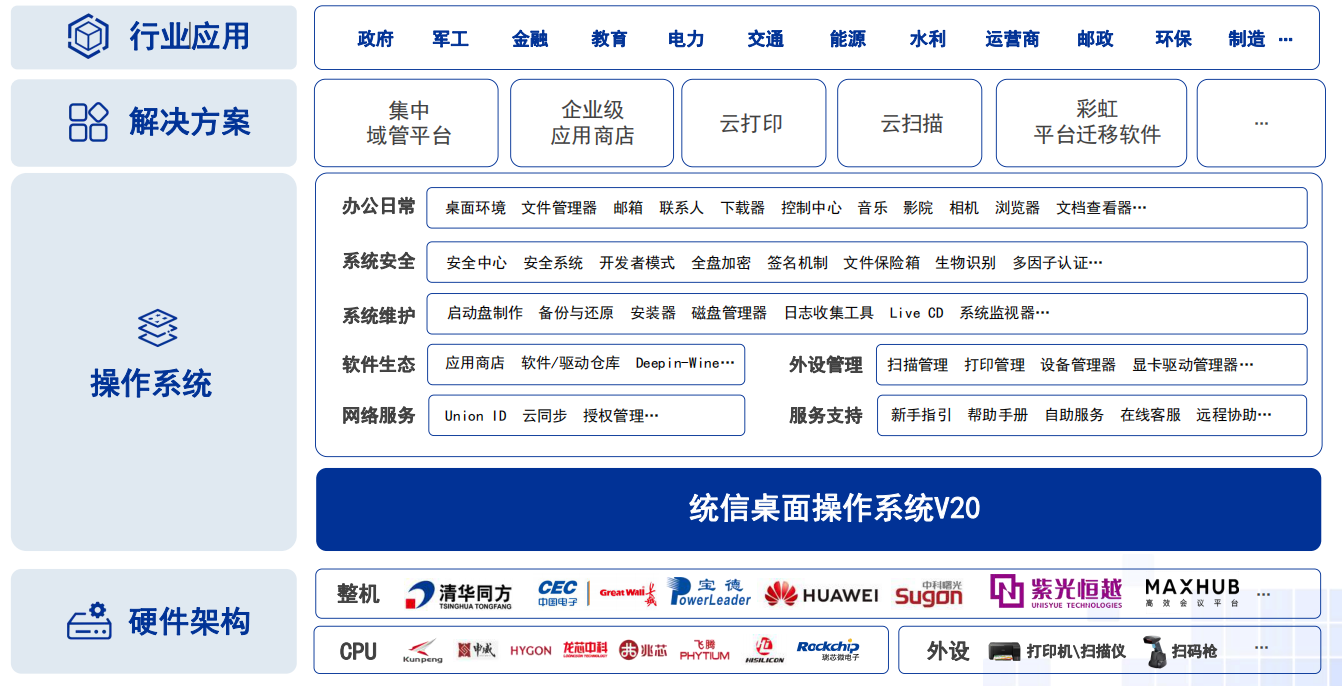统信操作系统V20 根据国人审美和习惯设计,美观易用、 自主自研、安全可靠,拥有高稳定性,丰富的硬件,外设和软件兼容性,广泛的应用生态支持,兼容国产主流处理器架构, 可为党政军及各行业领域提供成熟的信息化解决方案。
