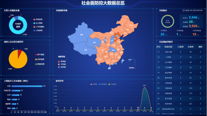 系统以人防、技防融合串并为手段,依托大数据预警数据,实现对区域内人员及存在风险的外地抵达人员进行全面详尽的调查核实工作。系统构建以防疫工作为中心,各镇街为支撑,各村社区为基础的防疫大数据实战平台