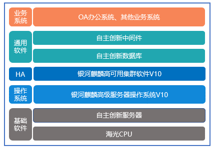 方案介绍:本项目采用国产x86海光CPU芯片+银河麒麟高级服务器操作系统V10+银河麒麟高可用集群软件V10为底座的技术路线。基础通用软件采用国产数据库及国产中间件等全国产化基础软硬件,为了保障业务系统的安全性,业务系统采用双机热备部署模式,并对原有OA、办公平台服务器及办公电脑完成自主产品应用,构建一个安全稳定的办公环境。