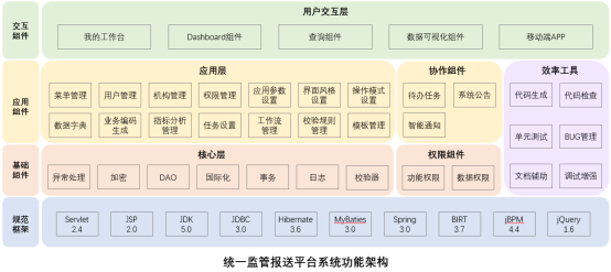 监管平台功能整体架构基于开源框架,能支持第三方扩展,能兼容各种内外部接口,使得平台架构兼具安全性和开放性和灵活性,而逻辑分层及功能区的明确划分,也有利于开发规范的落地,所以架构也非常容易进行后续的维护与扩展。在应用功能上,我们充分考虑了监管报送的各类业务场景,针对性的增加了各类功能,如针对监管场景设计的工作流定制,校验规则管理,针对提升业务用户使用体验的个性化风格配置,操作模式设置,智能消息推送等功能,针对开发人员提供的代码生成,代码检验,以上这些功能较大的提升了各类用户的操作体验和作业效率。