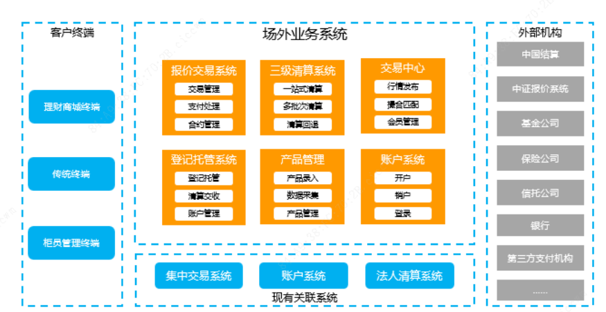 金证场外柜台交易系统,简称金证OTC系统,包括报价交易、清算、交易中心、账户管理、产品中心、消息中心等子系统,可实现场外市场的日间委托交易处理及日终清算、客户信息产品信息维护、转让撮合等功能