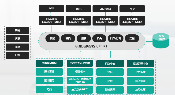 集成平台按照国家的卫生信息互联互通标准化标准为依据进行建设,医疗应用集成平台采用面向服务的架构(SOA),以企业服务总线(ESB)的方式,采用国家的卫生信息交互标准的通讯协议,实现医院应用系统之间的互联互通、信息共享、流程协作。以企业服务总线(ESB)方式实现全院范围内跨部门、跨系统的信息交换逻辑,包括交换接口的定义,交换信息校验,交换协议转换、交换信息组装、交换路由控制、信息订阅。通过对HIS、电子病历、医技系统、护理系统等既有业务系统接口逻辑的改造,将医院系统之间信息共享、流程协同以及和上级卫生信息平台之间的协同按照互联互通集成规范要求通过企业服务总线(ESB)来提供服务。平台通过一系列有机结合的核心组件包括集成规范,ESB企业服务总线,主数据管理,主索引服务,消息中心,管理中心,监控平台等集成医院以及医疗机构的业务数据,实现医疗信息系统的“互联、互通和互认”推动医院业务模式的创新,优化医疗服务环境,提供医疗协同服务,成就“智慧医疗”的愿景。