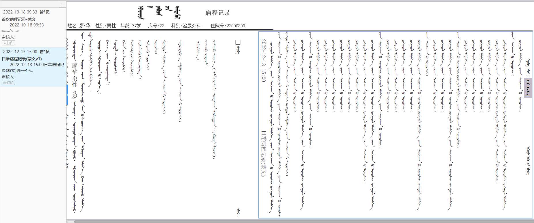 九天智信蒙文电子病历系统,遵循蒙文的书写规范与最新的国家标准与规范,秉承一体化、规范化、后结构化、智能化、人性化的设计理念围绕以患者为中心,以临床业务流程为轴线,以医生工作站为驱动,以智慧化应用为目标的设计方法,实现医嘱、病历、护理、临床、质控及院外服务的完美融合,为蒙医的医护人员提供更加专业、安全、高效、便捷的应用体验。