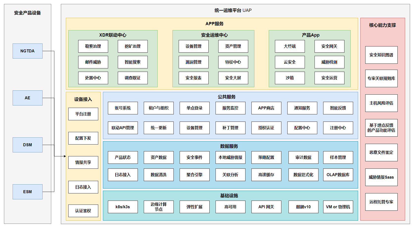 擎、文件分析引擎、Sandbox 等核心能力,实现网络、终端、服务器、边界安全事件的及时告警、高效