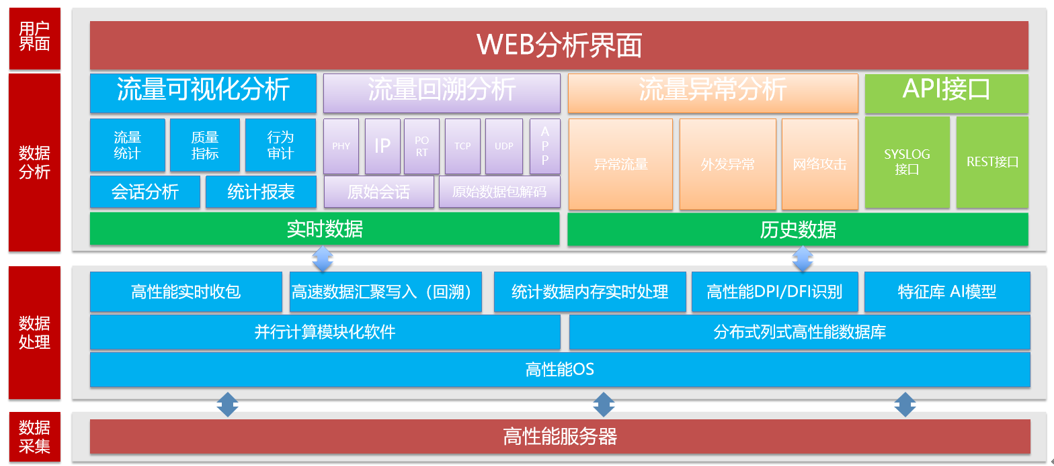 流量分析系统是一款大容量存储的高性能数据包采集和分析平台,可以分布部署在网络的关键节点,实现了对网络通讯数据包级的高性能实时分析。通过采集网络数据流量,进行数据包存储,通过数据挖掘、结构化的数据处理、可视化的呈现,来实现对网络数据的实时流量可视分析、流量回溯分析、流量异常分析,直观掌握网络情况,快速分析定位故障,提升对关键业务的运行保障和问题处置效率。