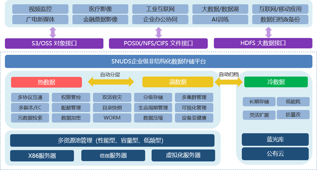 非结构化数据存储平台是一款面向海量非结构化数据的统一数据存储平台,同时支持多种数据访问协议及多协议间数据无损互通,满足数据全生命周期管理的需求,为上层业务提供高可靠、易扩展、高性价比的海量数据存储。作为企业的数据存储和流转中心,用户通过文件、对象、大数据接口等多种协议高效存取和管理日志、图片、音视频、文档、邮件、数据表等各类型文件,支撑企业丰富的上层业务和数据分析系统应用,帮助企业持续最大化地利用数据价值,更快地获取商业洞察。