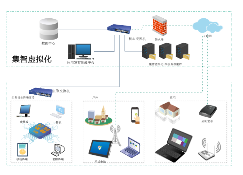 随着信息化的快速发展,对IT资源的交付需求也越来越高,传统独立部署交付应用的 方式在应用层出不穷的今天逐渐显出低效不足的劣势。集智VA应用云平台打破应用程序、操作系统和硬件之间的联系,让用户可以在任何时间、任何地点、使用任何设备、采用任何网络连接方式,高效、安全的访问应用和资源。集智(VA)应用云平台采用应用虚拟化技术,对应用资源进行整合,为用户进行按需交付应用模式更符合信息化发展的趋势。
