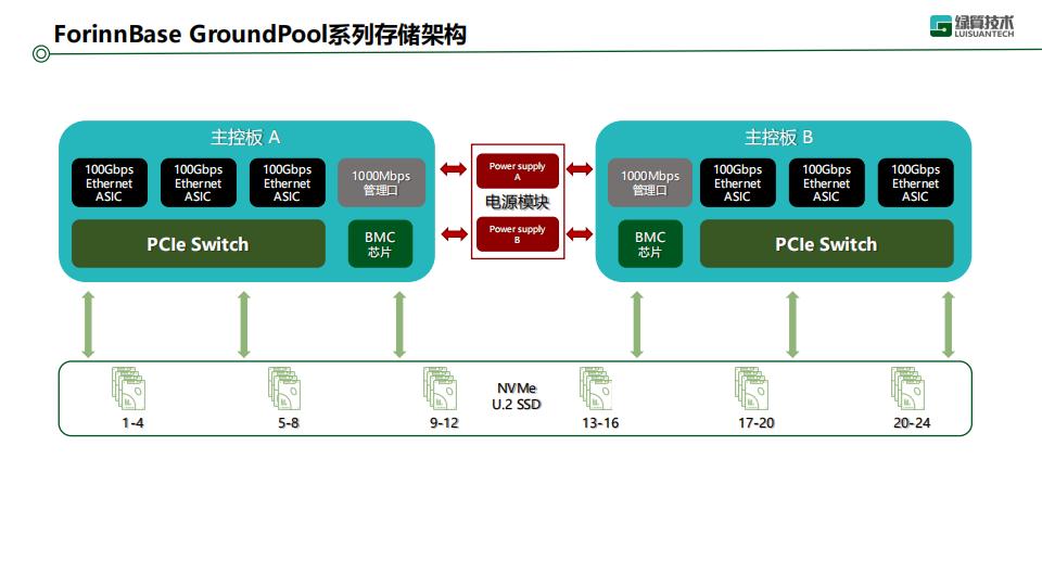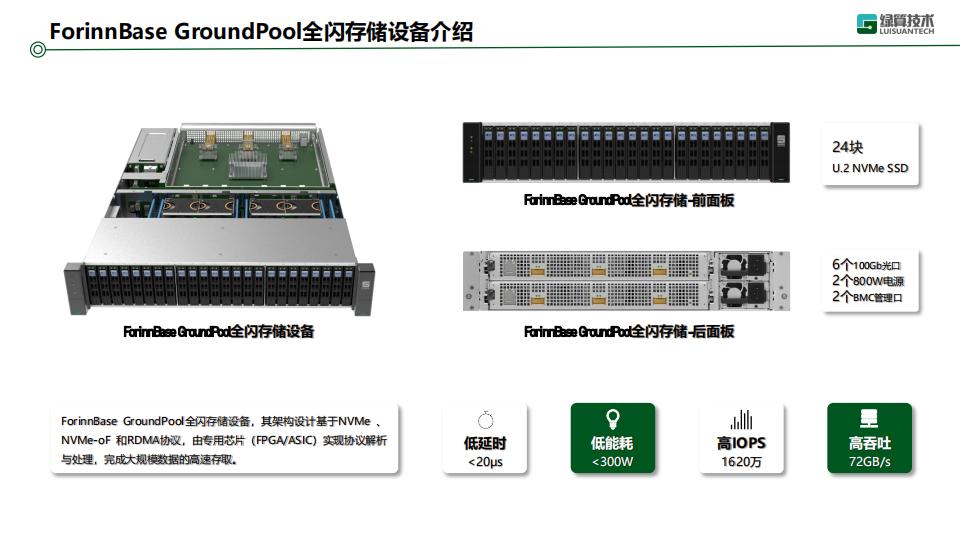 ForinnBaseGroundPool系列超高性能存储设备,整机架构设计采用NVMe-OF RDMA协议,完全由硬件(FPGA/ASIC)实现协议解析与处理,存储平台具有高性能、低延时、低功耗的优势。