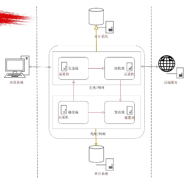 外网数据安全交换组(包括:导入前置外网机+进网外部可信服务接口+ 导入服务,出网外部可信服务接口) 内网数据安全交换组(包括:导入前置内网机+进网内部可信服务接口+ 导入服务,出网内部可信服务接口)