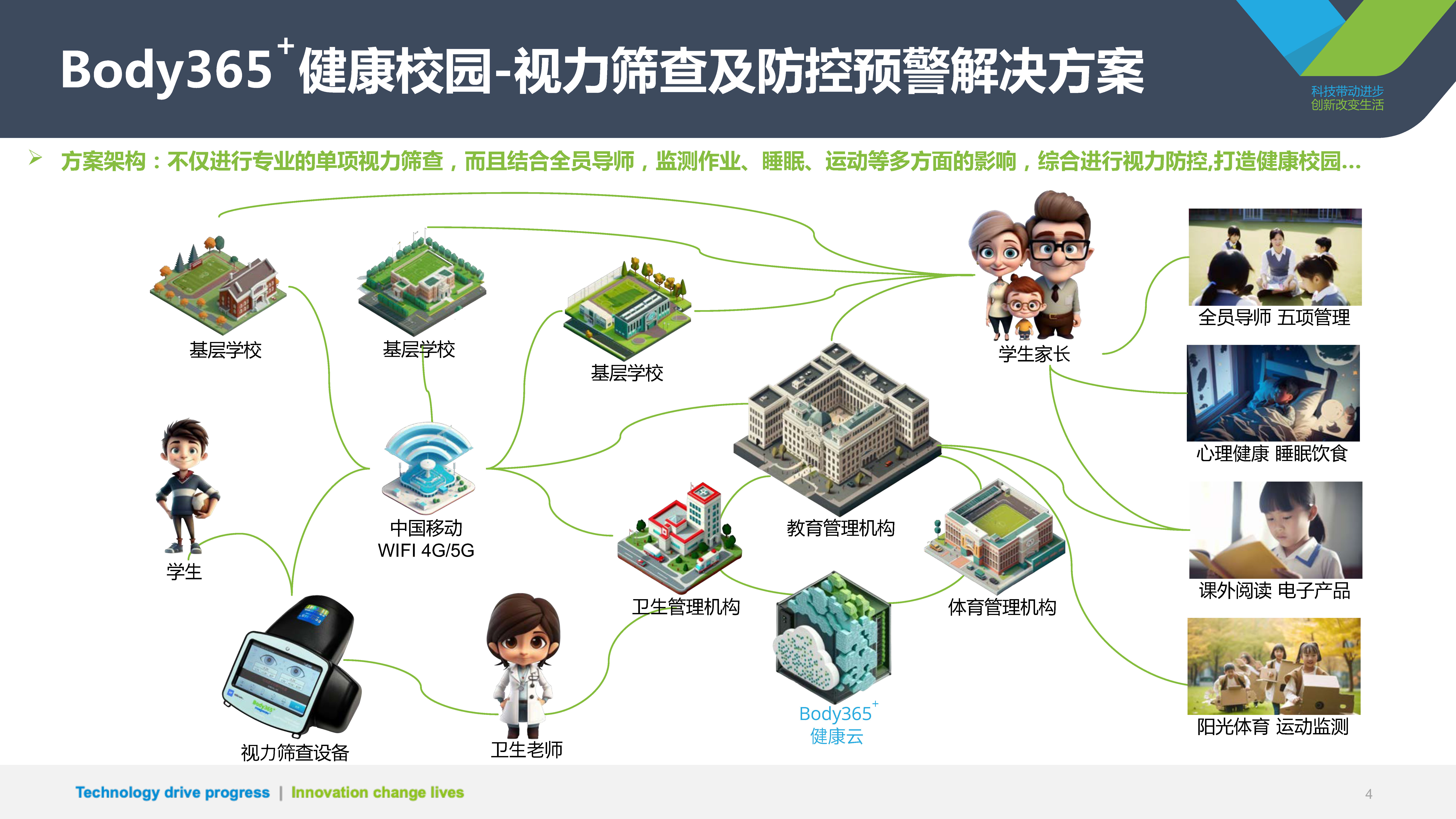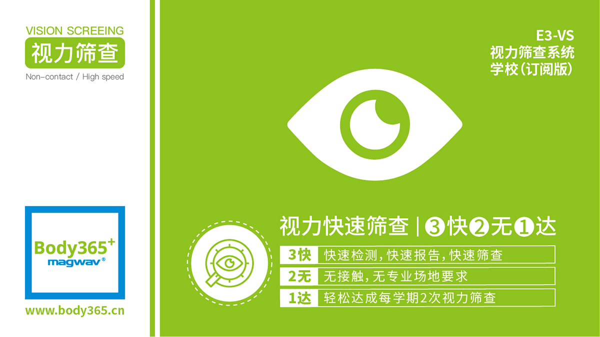 Body365+视力筛查及防控系统,无线接入全自动验光仪、视力筛查仪、生物测量仪等多种专业医疗器械,帮助用户快速、轻松地筛查从6个月大患者到成年患者的视力问题并同步录入系统,其中无接触筛查方式,从1米左右的距离同时筛查双眼,2秒钟即可完成筛查,与传统方式相比,1000多名小学生的单设备筛查时间,由2-3天降至几个小时即可完成。基于企业自主研发的AI技术,结合全员导师等板块针对遗传因素(父母近视度数)、环境因素(学校家庭光照度)、用眼方式(不当姿势距离)、用眼时间(学习娱乐时间)、室外运动(阳光环境远视距体育运动)、睡眠饮食(眼部休息及发育)等为每个人自动创建独立的分析模型,并能根据视力变化曲线自主验证学习,不断升级完善模型,给出并影响较大的可能性诱因,预测发展趋势及个性化防控处方。