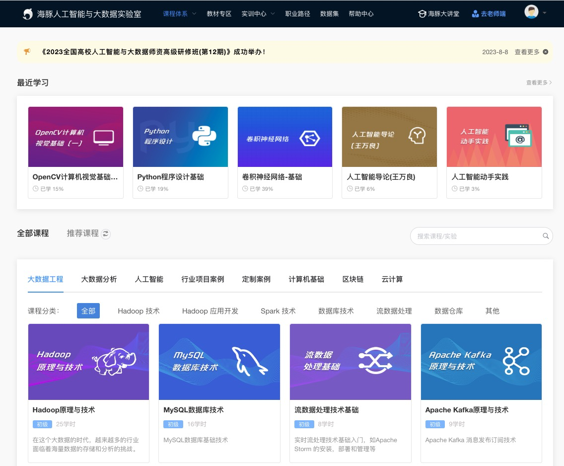 海豚大数据及人工智能实验室 V1.0是在云计算、大数据、人工智能等基础上,以智能化容器集群技术搭建的“一站式”人工智能、大数据等相关专业的实验、实训、实战平台,支撑“教-学-练-赛-研"等全闭环的专业建设、人才培养、实验室建设等整体解决方案。