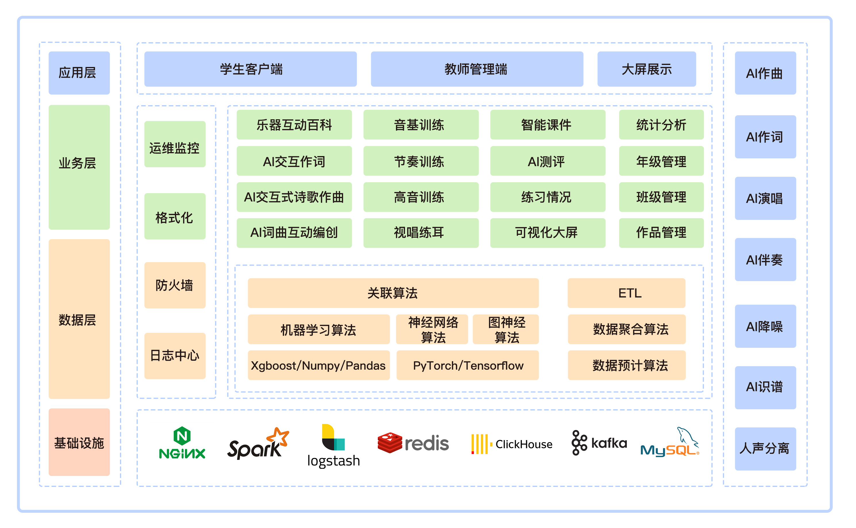 AI音乐教育平台秉承以先进的人工智能技术促进教育数字化转型,赋能新时代素质教育创新示范,系统依托AI+音乐+美术技术为基础,提供了AI作词、AI作曲、AI演唱、AI评测、AI绘画、AI评测、AI MV制作等功能,从语言、视觉、听觉三方面来一体化帮助实现创新创作、个性化学习等教育目标,可扩展应用于学生心理健康建设、特殊教育音乐治疗、乡村音乐教育振兴等。