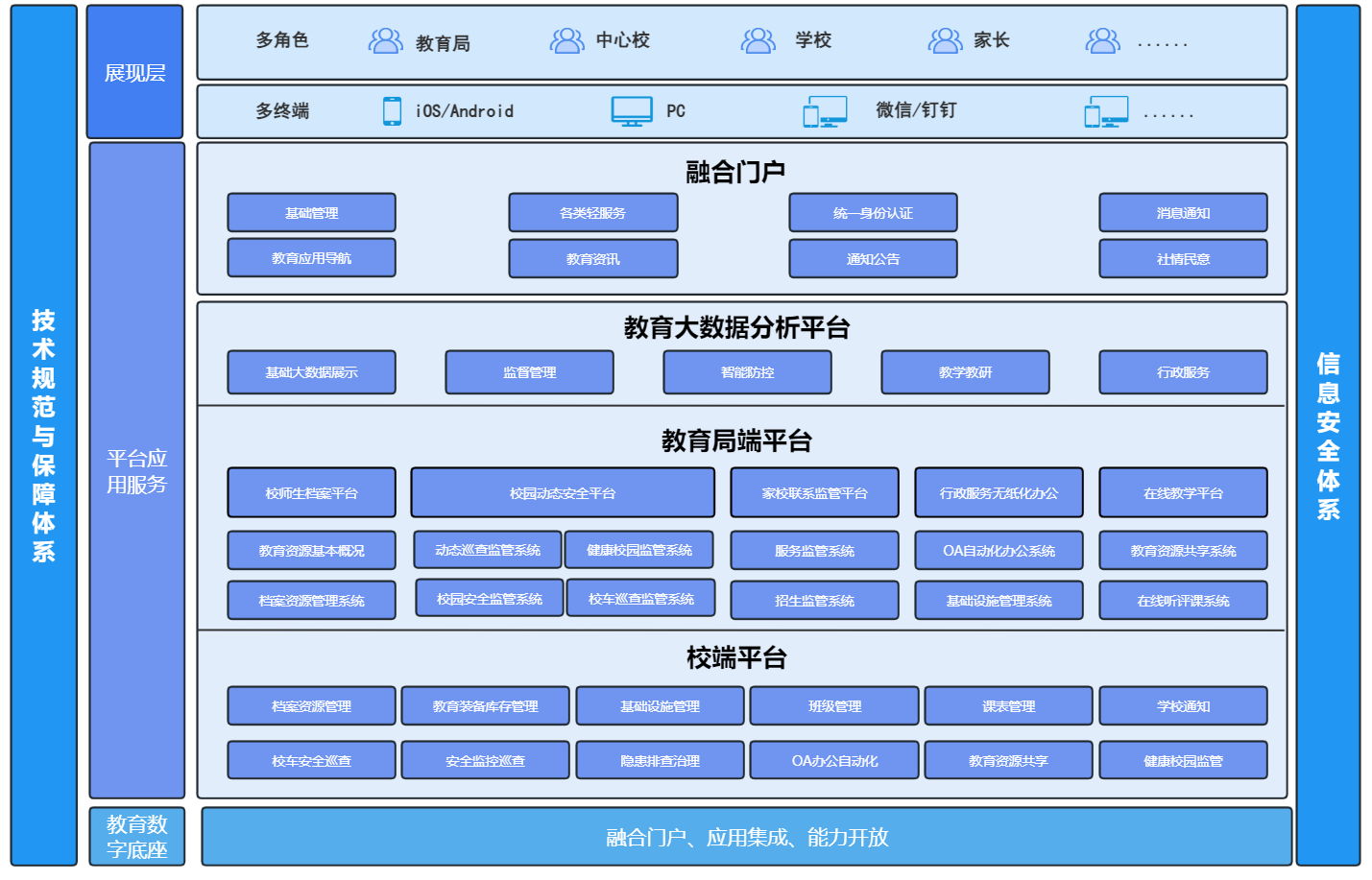 平台结合教育行业特点及信息化现状,按照“一融双督”的设计理念,(一融:建设统一的融合门户平台,融合现有教育资源,实现统一入口、统一管理。建立数据分析模型,实现大数据分析,为领导决策提供数据支撑。双督:内督质量,狠抓教学过程促提升;外督行为,狠抓教育管理促规范。)构建具备融合能力、统一认证能力、应用扩展能力、数据治理能力的教育新基建底座,运用信息化手段创新教育教学管理监督新模式。