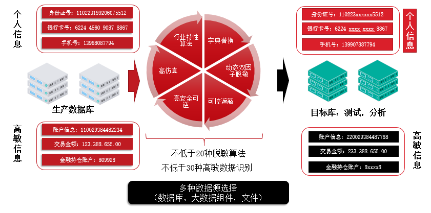 数据脱敏系统是我司自主研发的针对敏感数据的主动遮蔽及仿真类安全产品,通过采用特定的脱敏算法将敏感数据进行遮蔽或仿真以达到保护高价值数据及隐私数据的目的。