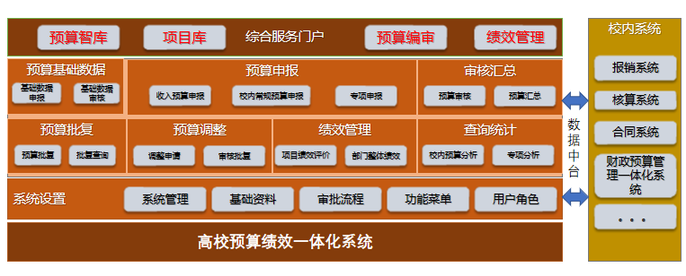 预算绩效一体化系统能够将不同预算资金项目纳入平台,落实管理的规范性;建立资金使用全生命周期的管理、监督信息化机制。包含预算申报模块(校内常规预算申报审核+专项项目预算申报审核)、预算汇总模块、预算批复模块、预算调整模块、预算综合分析模块、预算绩效评价、领导驾驶舱模块,力争建成学校包括各级部门、政策和项目的全方位、全过程、全覆盖的预算管理体系,实现预算和绩效管理一体化。