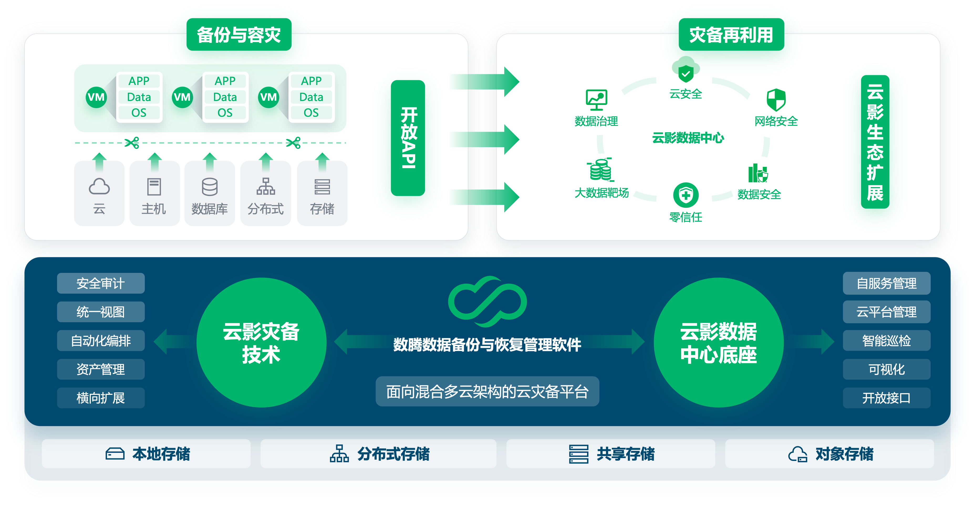 数腾数据备份与恢复管理软件以云和虚拟化为核心技术,是支持备份/应急/容灾/数据再利用的解决方案型灾备产品,支持传统架构(单机/双机/集中存储等)与新架构(分布式/大数据/容器/云等)的统一保护,并能够为用户第二数据中心提供基础支撑。