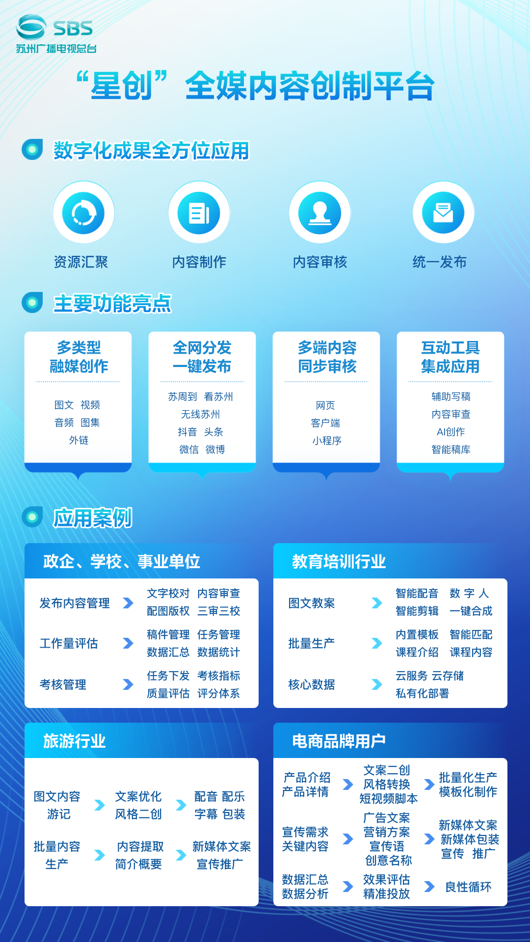 “星聚”资源汇聚平台以建设新型智能化数据管理平台为目标,利用云计算、大数据、区块链、人工智能、知识图谱等技术,为数据提供高可用性、可扩展性和高安全性的存储解决方案,对数据内容进行智能识别和标签生成,支持多类型数据的存储及精确检索,实现了文件秒传、版权管理、图片追踪、剪辑工具资源互通等多个创新性应用,为用户提供了集存储、管理、使用于一体的智能化数据管理平台,满足在不同场景中的数据管理和使用需求。“星创”全媒体内容创制平台,提供全类型稿件编辑、智能写稿、灵活多端审核的能力,满足电视、广播、新媒体、报纸、短视频等各类融合内容的创作,通过整合资源、优化生产流程、创新技术应用等措施,为融合稿件的制作、审核、发布提供一体化全流程的服务,同时引入人工智能等先进技术、丰富创作内容来源,改善创作体验,实现了融合内容创作的效率和质量的全方位整体提升,并解决业务调整中不断出现的新需求,为平台的长远发展奠定坚实基础。