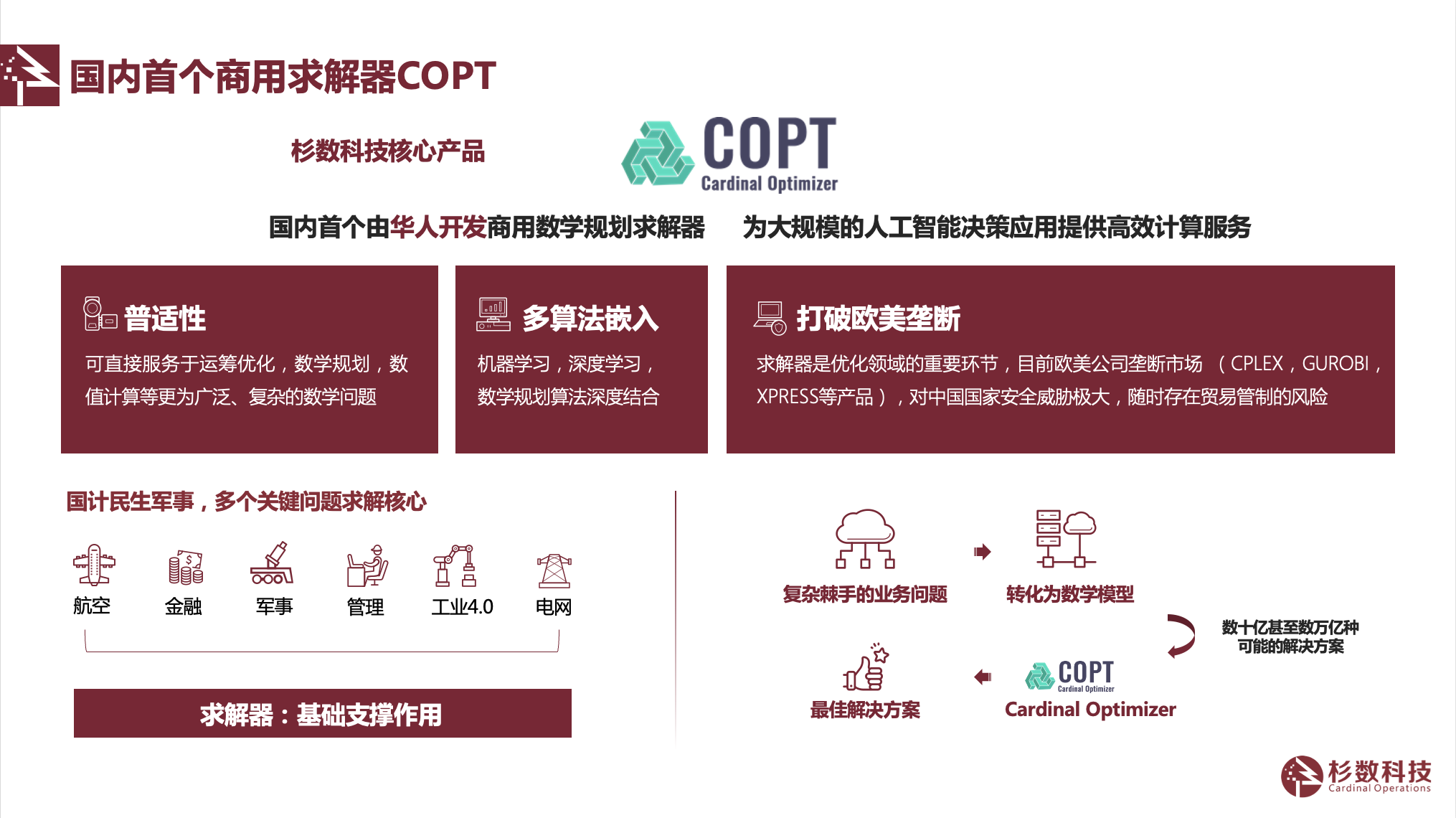 杉数科技基于最核心的COPT求解器和Planiverse和LibraMind、PonyPlus三款产品为多个行业提供成熟的数智化升级解决方案,包括但不限于食品饮料、美妆日化、消费电子、汽车制造、钢铁冶金、化工行业、轨道交通、石油电力、航空航天、军事国防、医疗器械、零售商超等行业及领域,为海量数据环境中的复杂问题提供解决方案,为社会创造巨大价值。