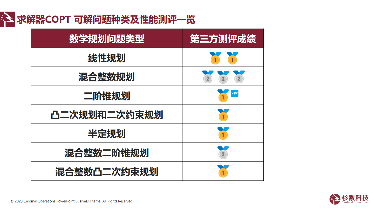 杉数求解器COPT(Cardinal Optimizer)是杉数自主研发的针对大规模优化问题的高效数学规划求解器套件,也是支撑杉数端到端供应链平台的核心组件,是目前同时具备大规模混合整数规划、线性规划(单纯形法和内点法)、半定规划、(混合整数)二阶锥规划以及(混合整数)凸二次规划和(混合整数)凸二次约束规划问题求解能力的综合性能数学规划求解器,为企业应对高性能求解的需求提供了更多选择。