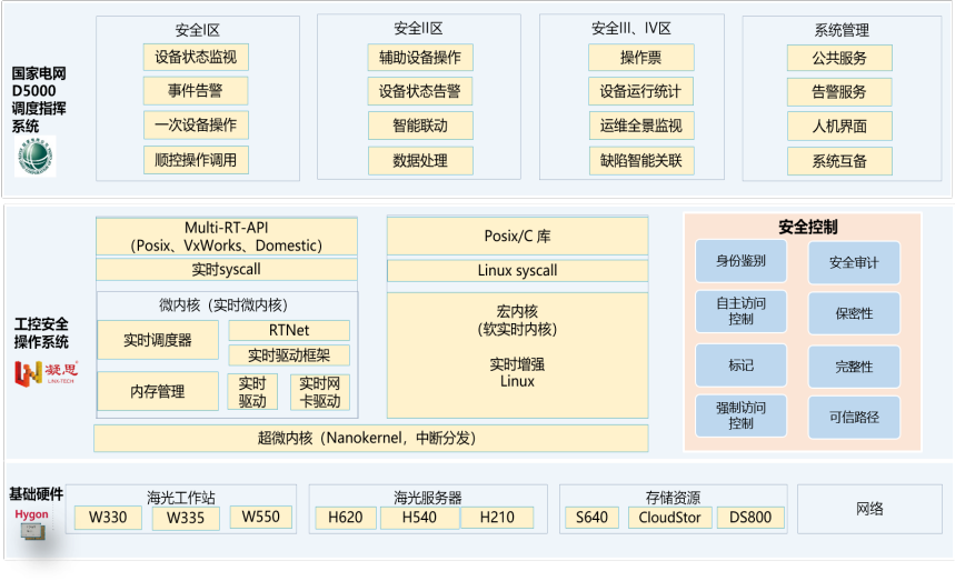 凝思工控安全操作系统是工业领域基础软件,提供丰富的设备驱动程序、接口函数库和实用工具,支持各类实时和非实时电力业务安全、稳定运行。与海光CPU硬件平台结合,打造电网调度D5000平台安全基座,为电力生产保驾护航。