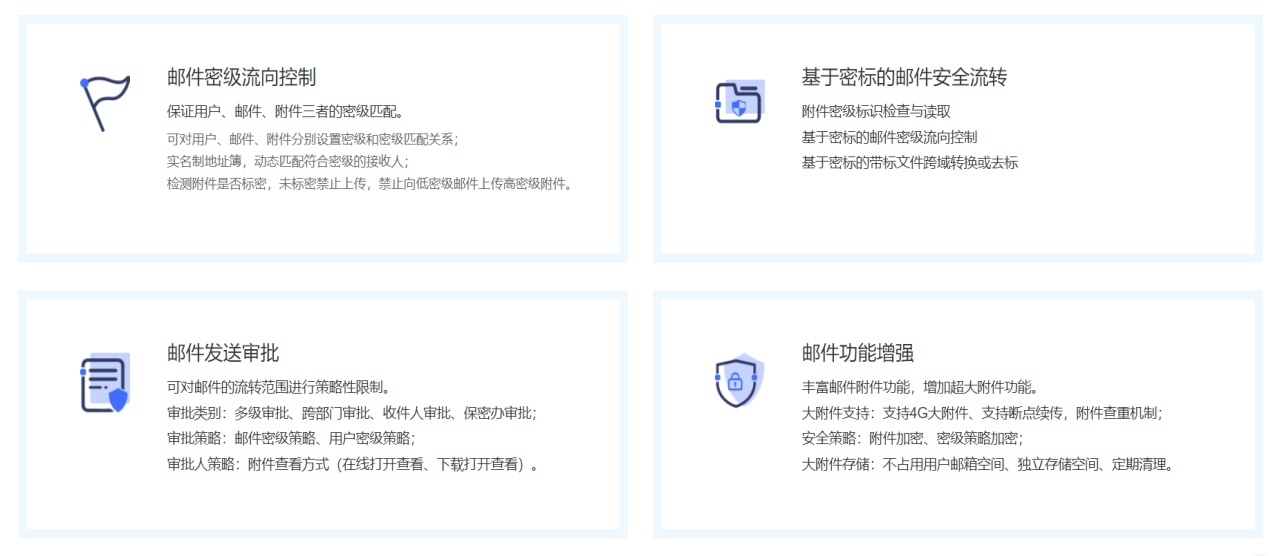 时代亿信安全增强电子邮件系统是在实现普通邮件系统功能之上,综合运用身份认证、数字签名、邮件加密、邮件信息跟踪、邮件及附件密级控制等技术措施进行安全保护,为军工等保密单位提供全程邮件加密保护服务和密级流向控制服务,也可为政府单位、大型企业提供机构间标准、权威、可跟踪、可归档审查的公务邮件服务。